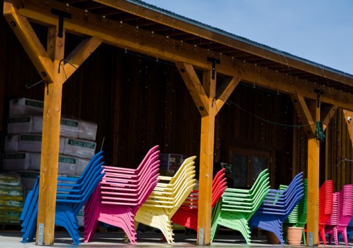 Although these chairs are made of plastic, their bright colors made me feel like Spring was closer. Even as the snow melt flowed off the metal roof!