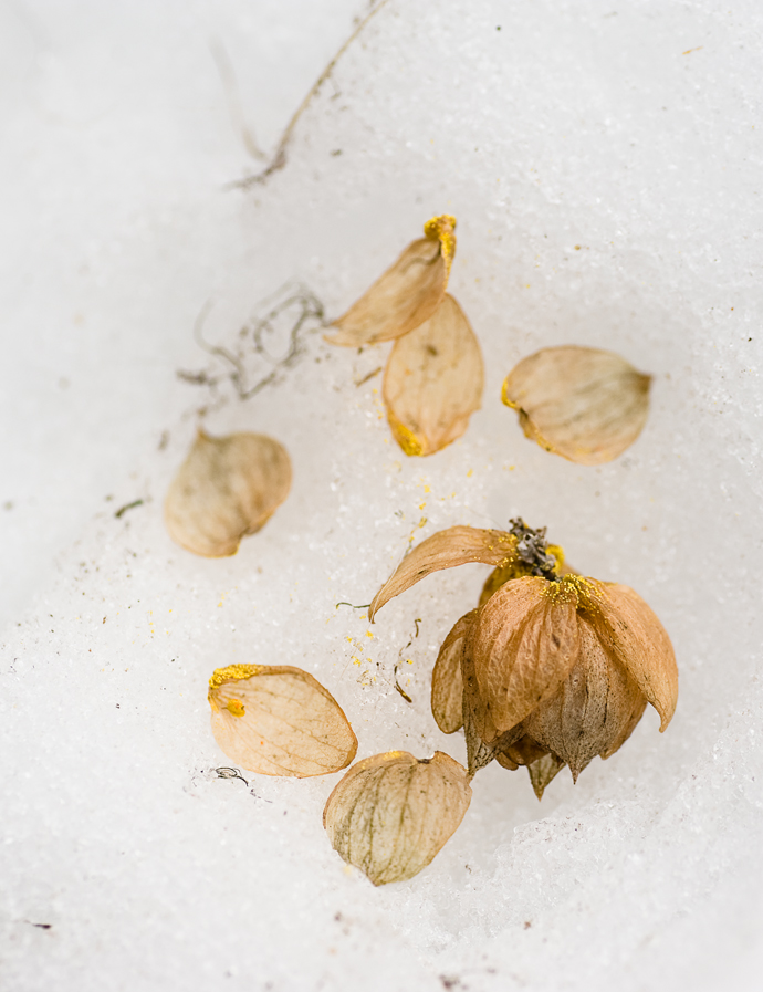 One of last year’s hops, drying in the snow.