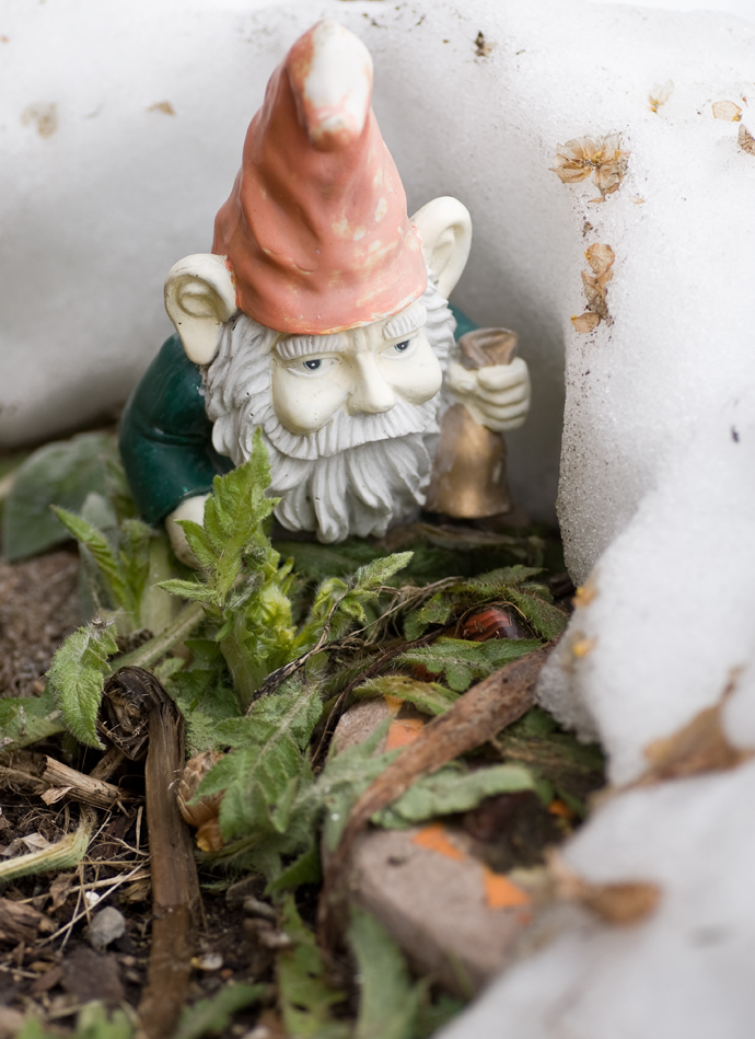 Jerome, the garden gnome, slowly emerges from the snow, ringing his bell to welcome the change of seasons.