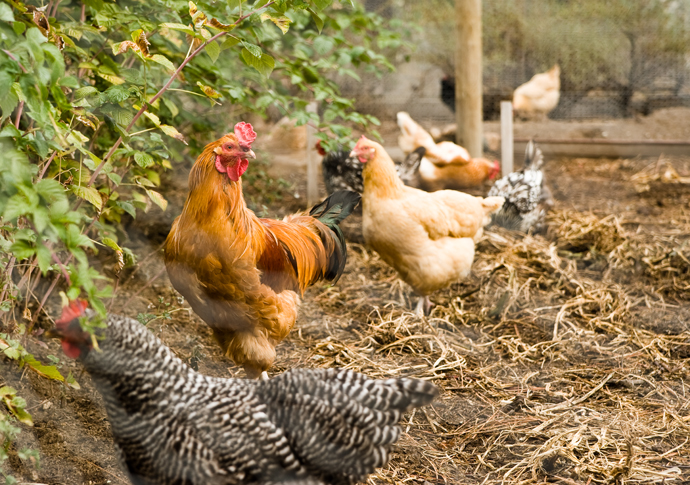 Our neighbors have a fabulous garden and I imagine that part of that is due to their chickens. These stocky egg layers spend much time scratching and eating bugs and making fertilizer within the protected confines of the garden. When I visited yesterday, the big red rooster was ruling the roost, so to speak, chasing away hens that got too close to where he was foraging and making sure others were producing fertile eggs. Mostly the hens ignored him and went about their business – eating, pooping and laying eggs.