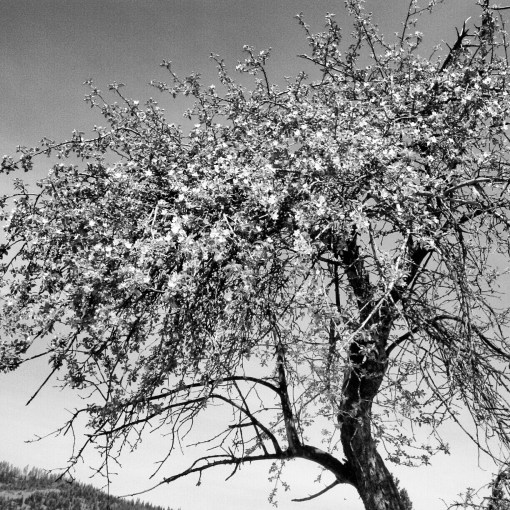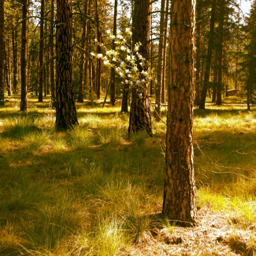 An ancient apple tree in bloom shows that someone once tried to make a life in this wild wet place in Idaho