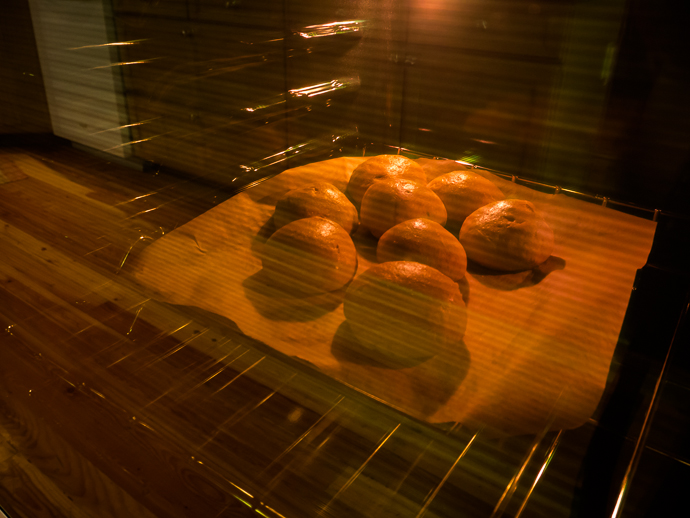 Dinner rolls in the oven. The dishwasher, that replaced the old one in February, is reflected in the window.