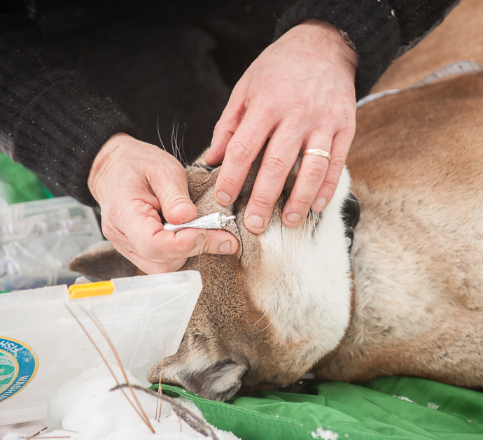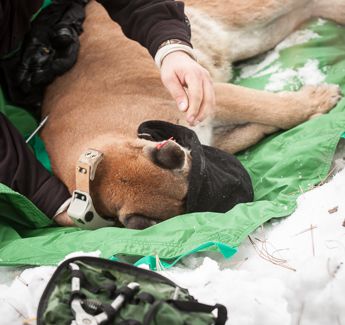 Collaring the cat. With this collar scientists will be able to track her movements. This is part of state-wide study of cougars.
