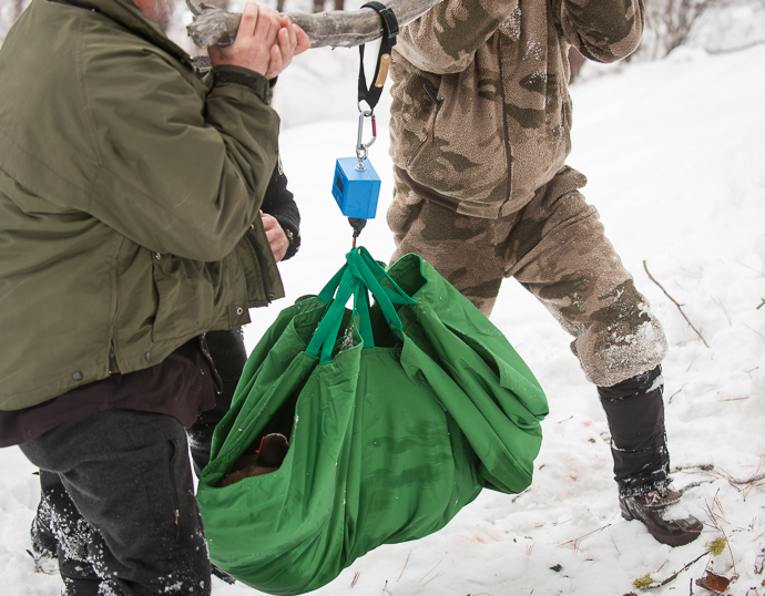 I wanted to see what was happening but I also did not want to intrude and cause trouble. I could not see the area where the cougar was treed so I drove slowly down our road til I could look across the draw through the trees and watch from afar. There was one biologist and four volunteers and two hounds that never quit howling. After they got the animal out of the tree they said I could walk over to observe what they were doing so I parked the car and made my way through the deep snow on the steep hillside.