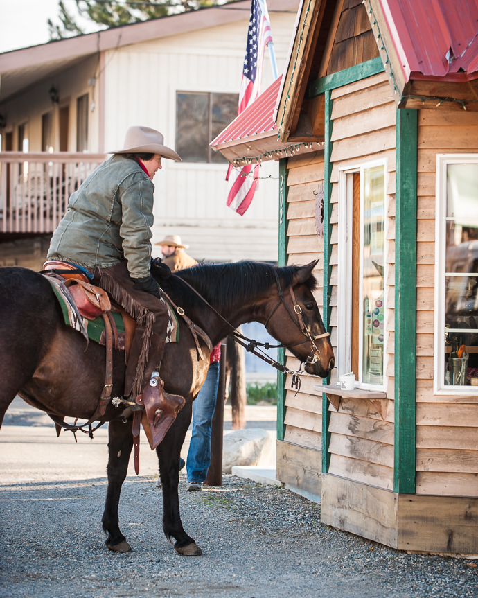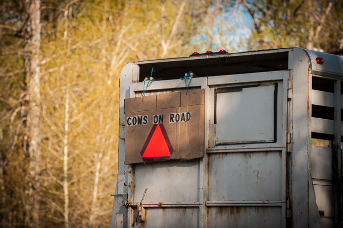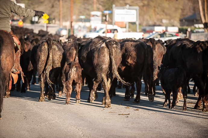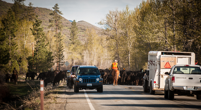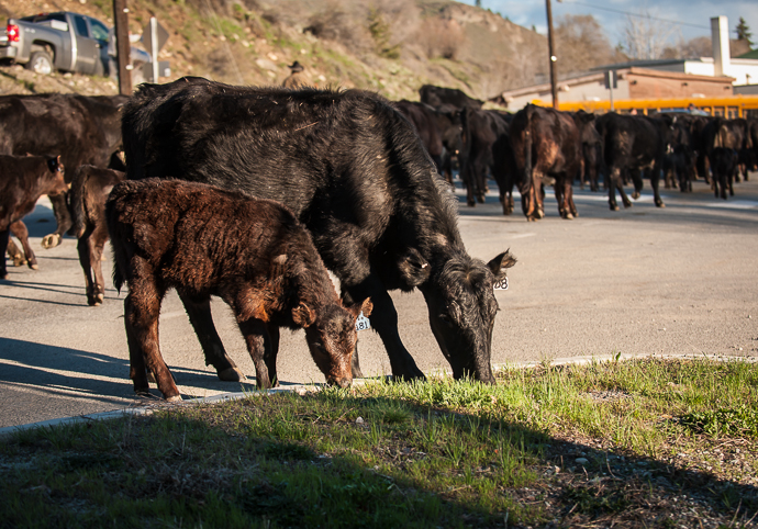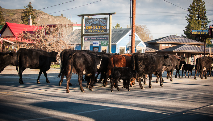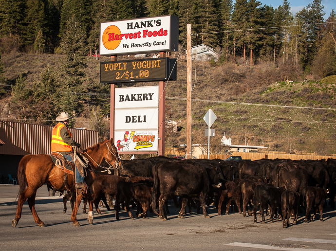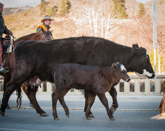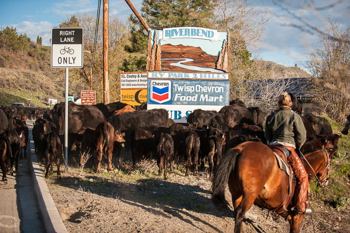 Every year cows need to be moved from the valley bottom where they winter and have their calves to the public lands on the state wildlife area where they spend the summer. Some ranchers find the easiest way to do this is to have an old-fashioned cattle drive right down the county road, through town and up the state highway on a Sunday morning. Yesterday was cool and clear – good for moving cows and making pictures. Lots of people knew about this ahead of time and were parked in good vantage points to see the cows pass through Twisp. Evidently this is a slow time of year for entertainment around here.