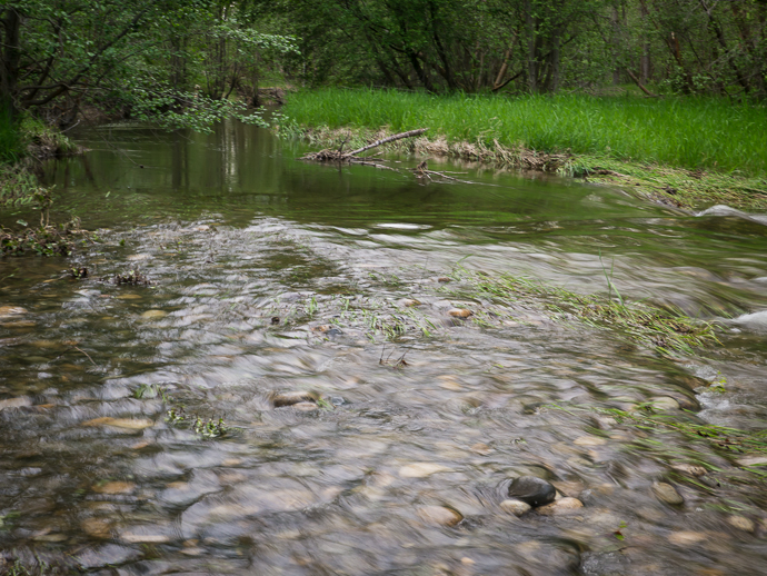 One evening last week we enjoyed a quiet stroll along the river. It is running quite high, normal for this time of year, and the side channels are all full too. Cottonwoods and aspens are as green as they can be. Grasses are lush. Spring.
