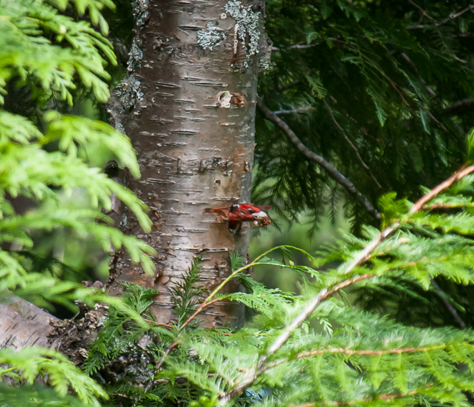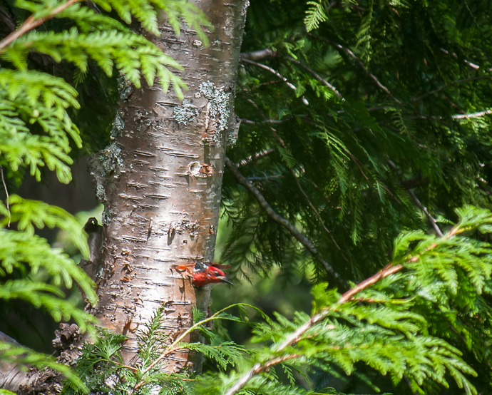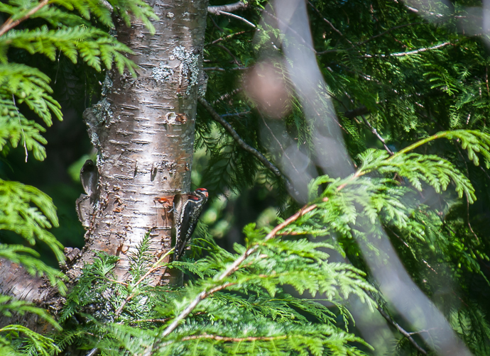 Kim has located a nest near one of the trails on the grounds of the North Cascades Basecamp which she and her husband own. It includes a male Red-breasted Sapsucker and female Red-naped Sapsucker. I was lucky enough to have her show me the nest in a water birch tree. We observed both birds going to and from the nest, catching bugs and visiting sap wells before returning to feed young. On one departure I observed that the male was carrying a fecal sack. These birds like to keep their nest tidy.