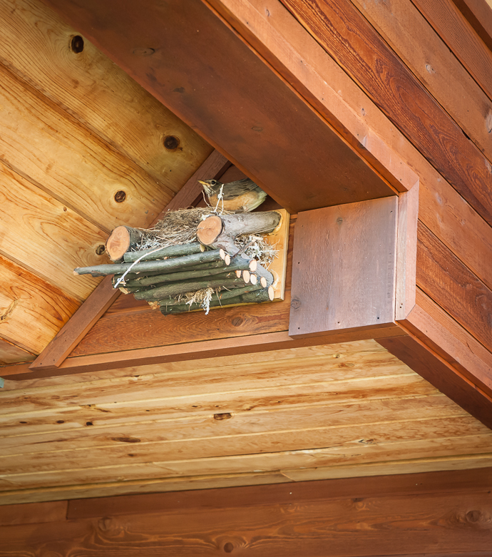 • Our neighbor made the little platform and Ken mounted it above the garden and the robin built the nest.
