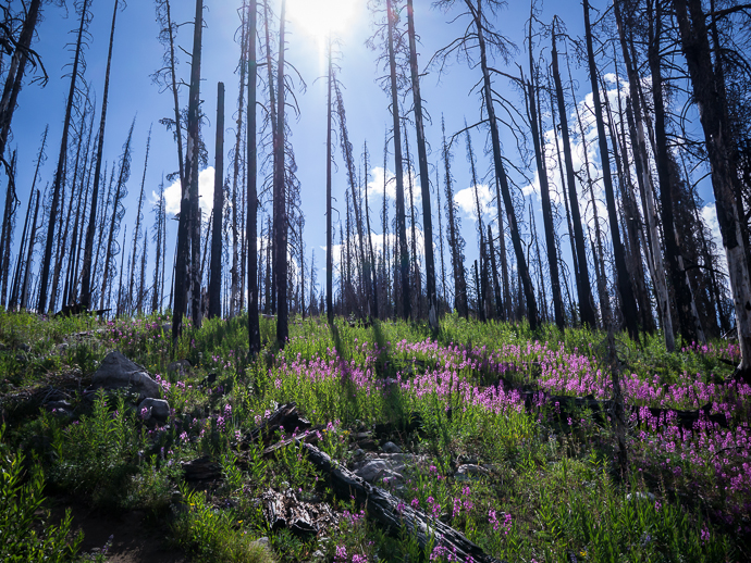 The trail begins by climbing steeply up from Freezeout. Fireweed blooms in the understory