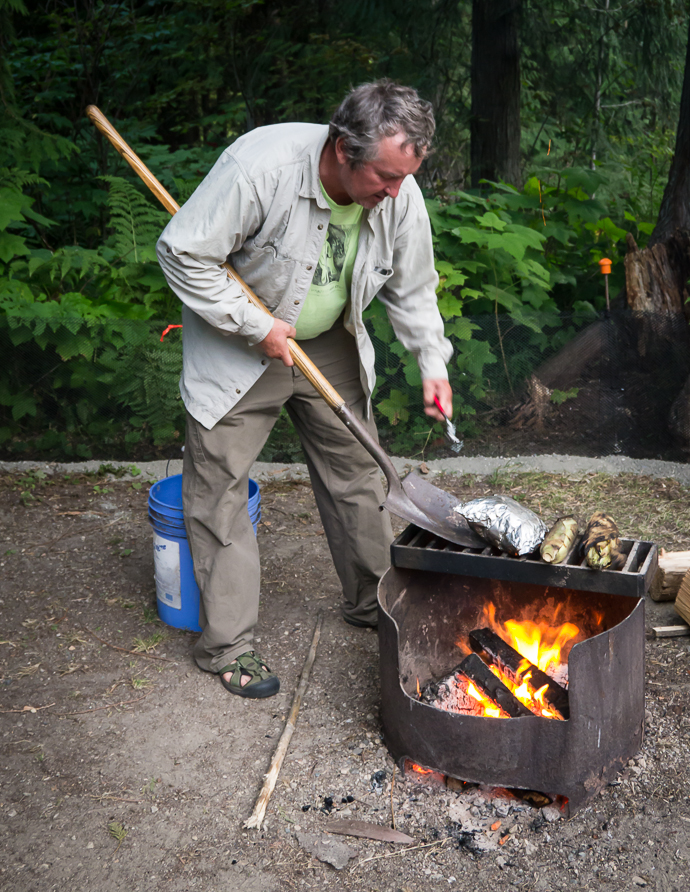 Ken demonstrates proper use of cooking utensils including a shovel and pliers