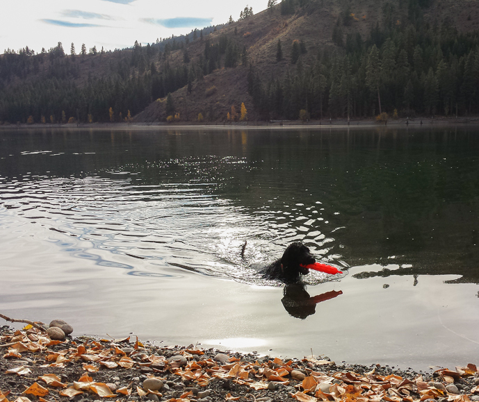 At Patterson Lake, Luna shows Sky about swimming and retrieving.