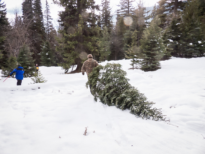 Ken hauls our tree down the hill. Don and Mary already had theirs.