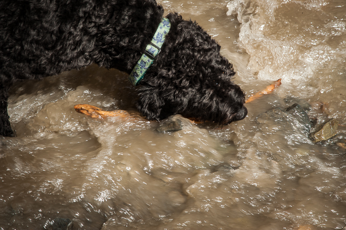 Luna gets a stick out of the muddy torrent