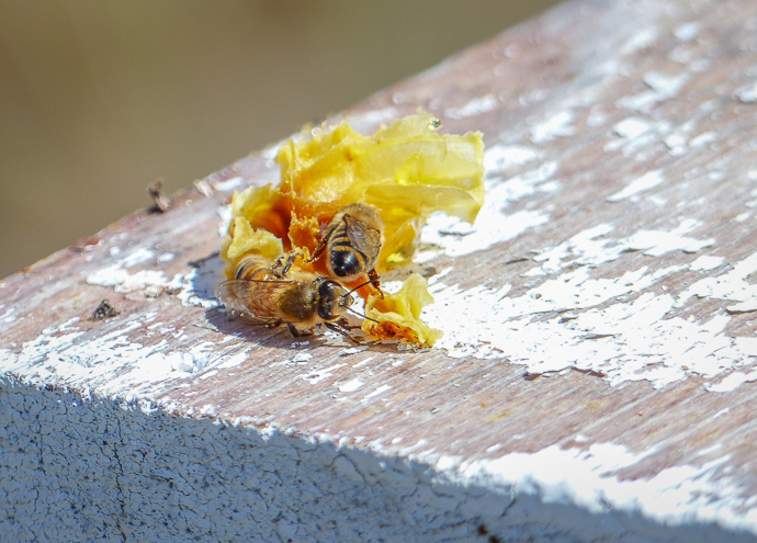 A small gob of wax attracts bees to the honey