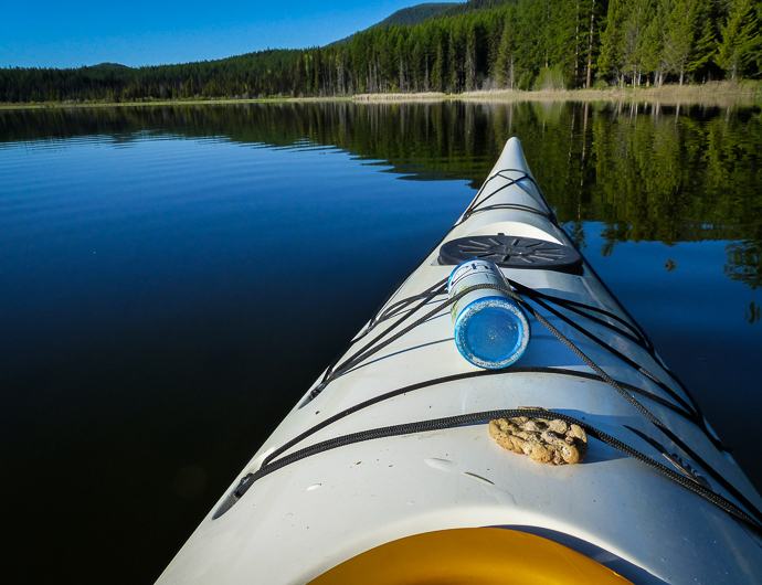 Homemade chocolate chip cookie and a smooth lake. Great way to start a day.