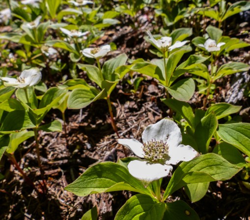 I think this is a dogwood known as bunchberry or Cornus unalaschkensis. I haven’t seen it around here before.