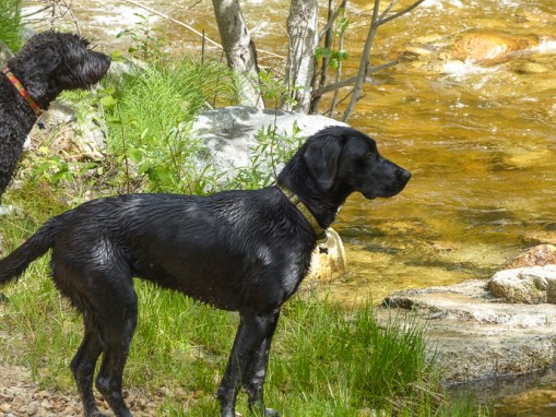 Sky waits for me to throw a stick in the creek.