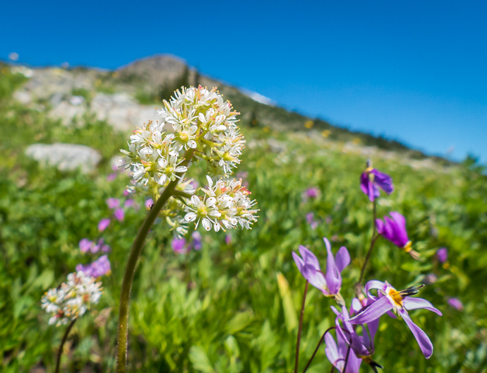 Pretty white flower that looks like miniature bear grass next to shooting stars