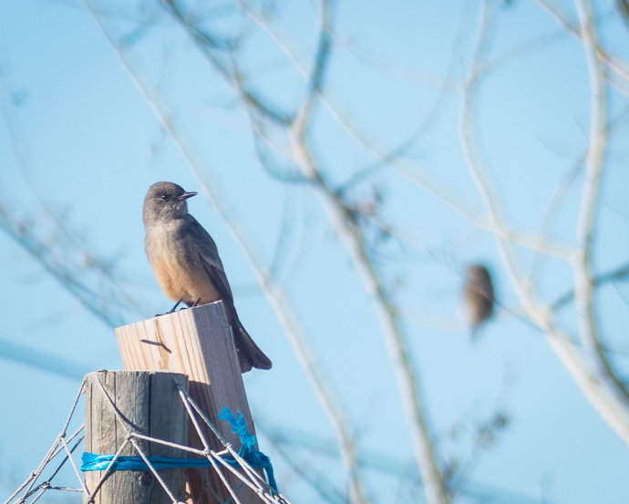 Say’s Phoebe with Northern Pygmy-owl in the background