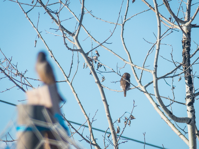 Say’s Phoebe with Northern Pygmy-owl in the background