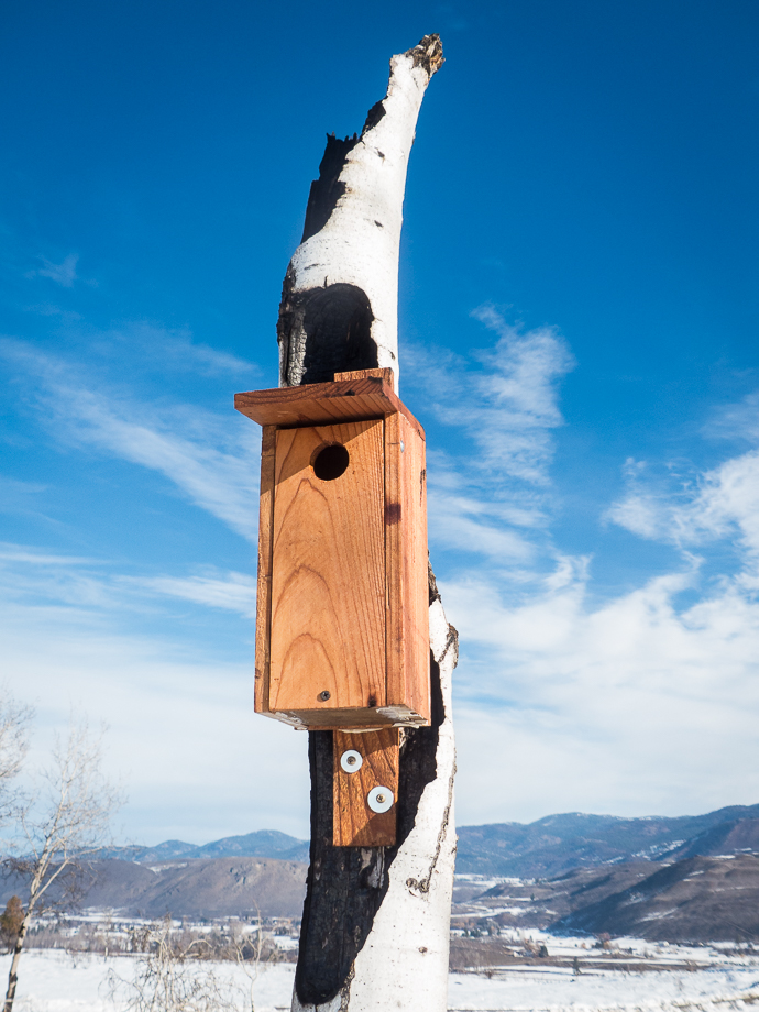 One of our neighbor’s new nest boxes on an aspen that burned last summer