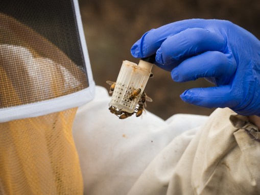 She is kept in there with a piece of hard candy. The worker bees will eat it and free her.