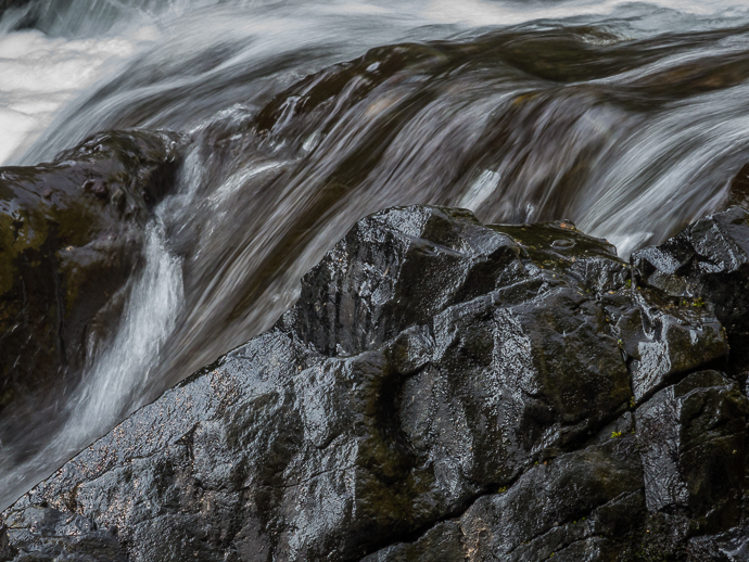 I stole this one for a screen image. It could be a black and white photo except for the hint of warmth from some tiny leaves and the blue reflected from the sky (?) on the water and the rock.