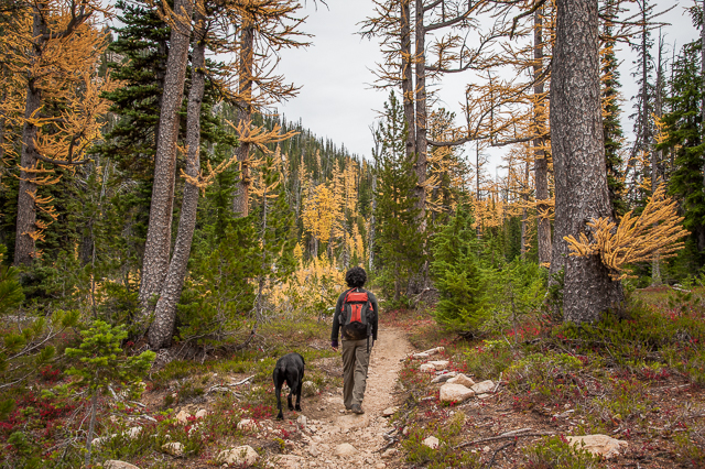 The start of our walk through the magnificent yellow larch trees