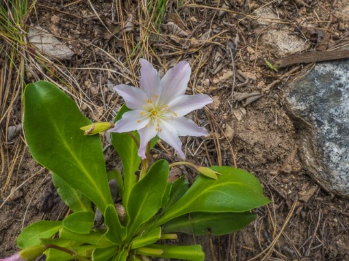 What a contrast between the dry dirt, rocks, and dead needles with that luminous flower…almost like a cactus flower.