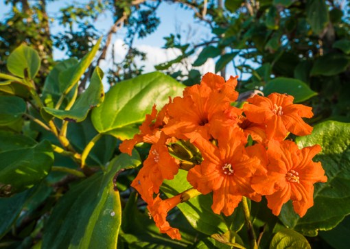 The flower of the orange-flowered ziricote tree. The boobys prefer this tree for nesting. The bird poop helps sustain the trees.