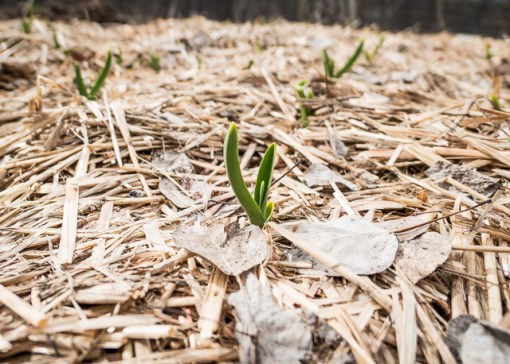 Garlic poking out of its mulch