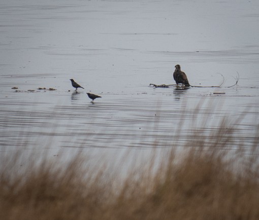 Young Bald Eagle scavenges on the beach with some crows in the rain.