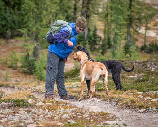 Mary taught Luna to get a drink from her hydration pack. Sky would not even try it.
