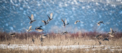 Mixed flock of Mallards, Northern Pintails and maybe some American Wigeons too.