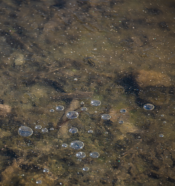 Bubbles under the thin ice near the edge
