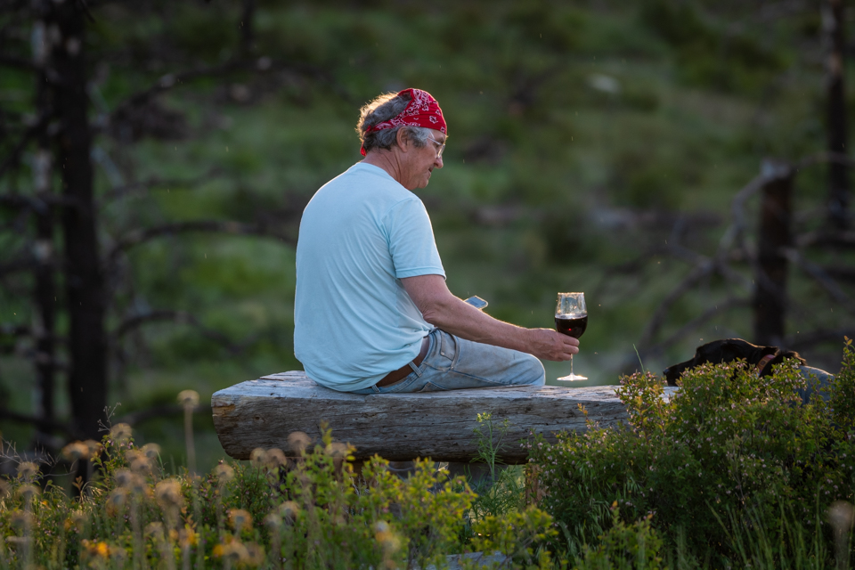 Ken enjoys a glass of wine while watching the sunset after hauling rock for our garden border.