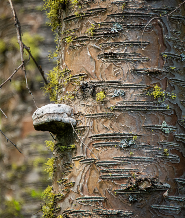 What an interesting and complex shot! Shelf fungus on the left? If not, looks like beak, with eye the knothole 2 o’clock from “beak”…there goes my imagination rambling off again….anyway, I like this. Are the horizontal slits due to the bark beginning to shed? If so, never seen that pattern in shedding before…used to patches or slabs. Maybe indicates fast growth?