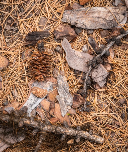 larch needles, cone, sticks and bark