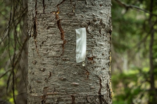 Strange things on trees. Quite a few trees along the trail have small pieces of duct tape. Why?
