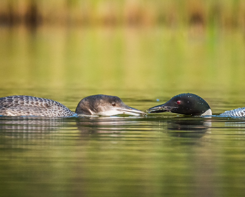 This is the family we saw back in June. The youngster was still quite little then. Look here and scroll down til you see the little loon. Now it’s two and a half months old and nearly as big as its parents who are still feeding it. A banding crew caught it sometime during the summer and it is banded and scientists may be able to find it in the future and discover its migration route.