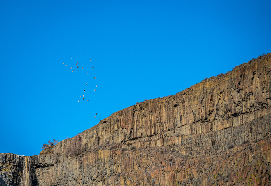 Rock Pigeons caught the sunlight as they soared around the coulee walls