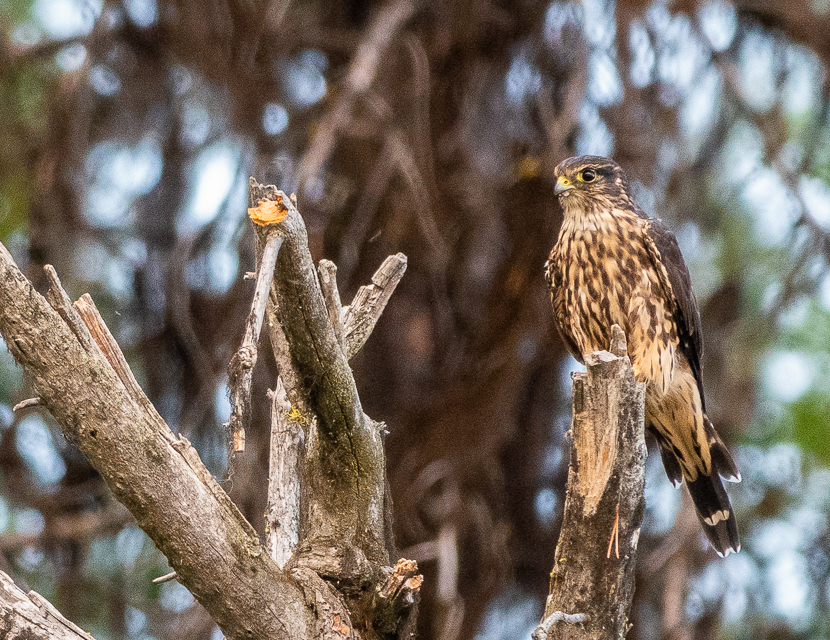 My Sibley field guide says this about Merlins: “Uncommon in open habitats. Nests in trees in forests with open areas. Solitary. Pugnacious; often harasses much larger birds. An active and energetic hunter; spots prey from perch or during low fast flight, closes with incredible speed, and attacks with abrupt turns, often from below. Feeds almost entirely on small birds; also takes dragonflies in midair.” It’s a pretty good description of the birds I observed.