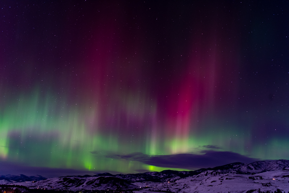Last night’s show of the Aurora Borealis was unbelievable. The lights were moving as if in a celestial dance. They glowed, made curtains, pillars, and moved throughout the sky from the northwest to the northeast and back again, sometimes filling the entire northern sky. They towered high above the horizon. They were green, red, pink and clouds glowed purple. Moonlight splashed a glowing light on the snow-covered landscape.