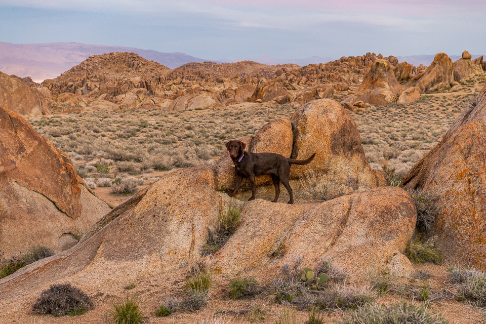 I was concerned that the rough rock and granite sand would be hard on the dogs’ feet but none of them had any trouble with it. And none of them had any run-ins with cactus needles! Willow and Juniper were fairly unseparable. Except when Willow found a ball and was not going to share it with anyone. She had great fun with it that evening and insisted on taking it in the car. We made one attempt at getting a four dog snapshot but it was not to be. Sky is the only that understands the concept of sitting for the camera. Willow will hold for a couple seconds but that’s it.