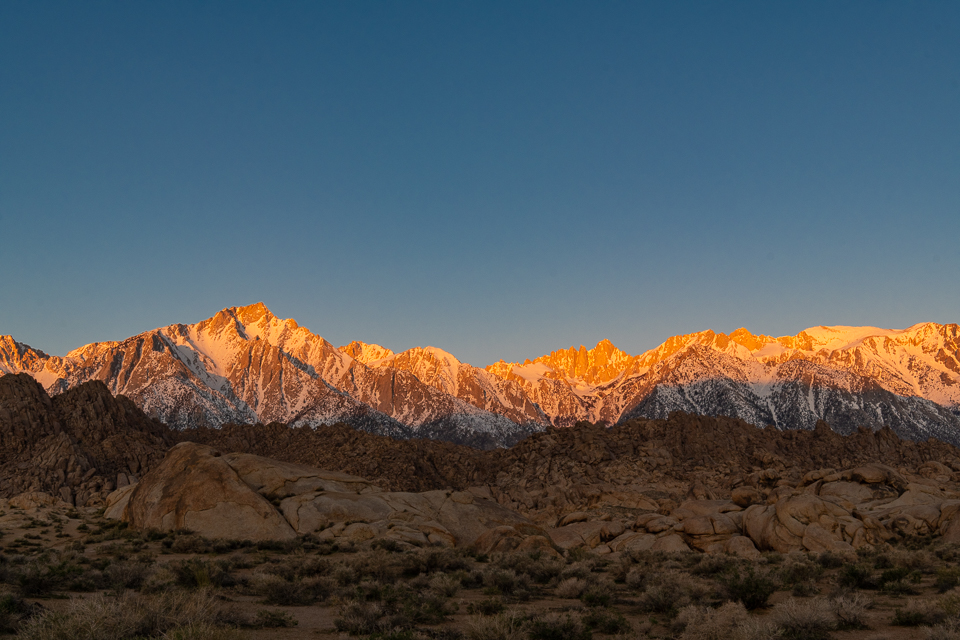 The light at the ends of the day is the very best. A person needs to walk at dusk and get up before the sun rises. We walked every evening amidst the rock formations and Mary and I got up at 4:30 am twice to capture sunrise on the snow-capped Sierras including Mt Whitney. It was magical. Except for that morning when the wind howled and we could not feel our fingers before the sun finally arrived! Still, the scenes before us were breathtaking.