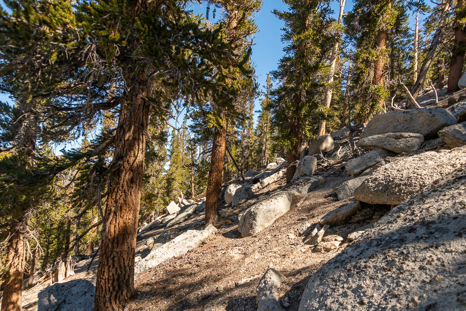 Before we left on our October road trip, Mary learned about the rare foxtail pine trees that are found in the southern Sierra mountains. They can live for over 2000 years! There is another subspecies that lives in the Klamath range in northern California. She found a location not far from where we were camping and made a GPS route on her phone for us to follow to find these unusual trees. We drove up a long (paved) road high in the mountains and once again we were around 10,000 feet! From there we had to drop down a steep road bank and then cross a meadow with a lovely meandering stream and then climb the steep ridge on the other side. The ridge was made up of pumice-like ground up granite and boulders. Not great walking, for sure. As we started up it, we commented on the lodgepole pines – so different from the lodgepoles in the Cascades and Rockies. Instead of being skinny trees growing in dense forests, these were open grown and large and had some character to them. I turned around and I saw a tree with much different bark! There it was! The elusive foxtail pine! We had barely climbed the ridge at all! As we looked some more, we could see they were everywhere! We continued to walk higher and higher, seeing more foxtails and fewer lodgepoles. After we’d had our fill, we returned to the meadow and then back up to the road where we found there were foxtails everywhere! We had been so determined to get to our starting point that we had not even looked around! It was a great adventure.