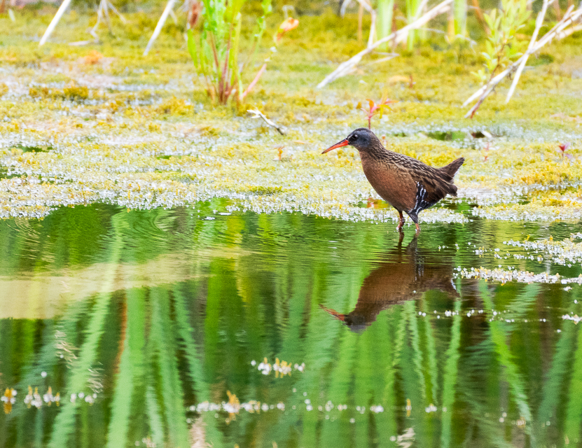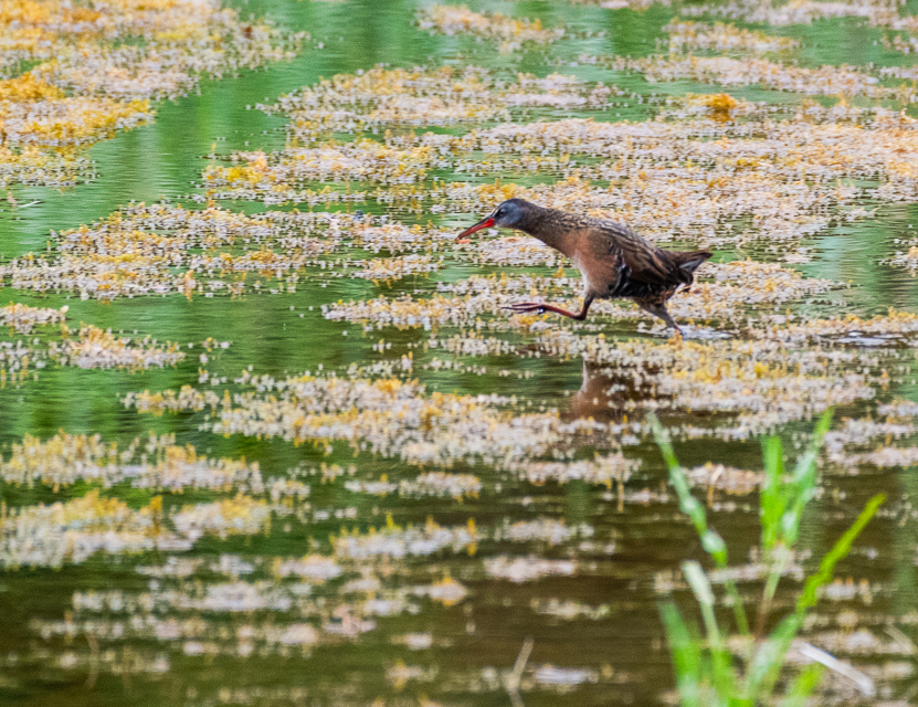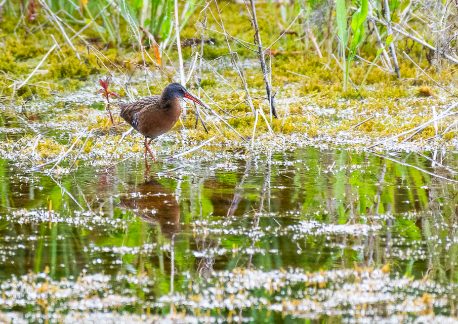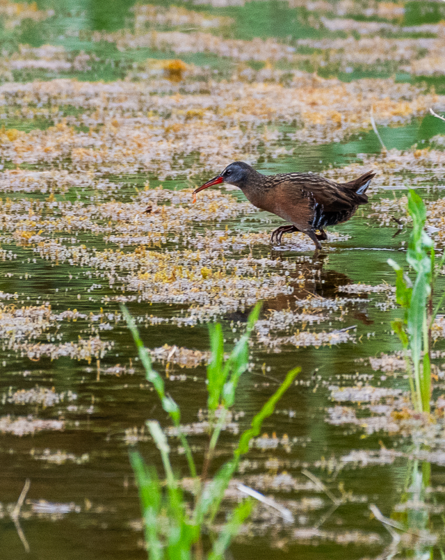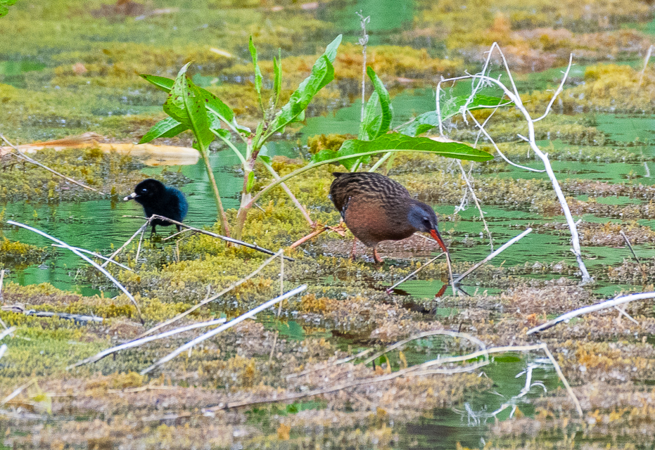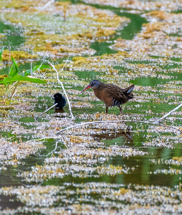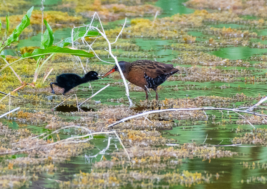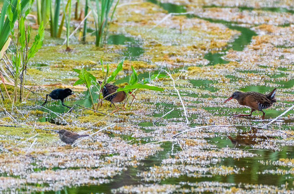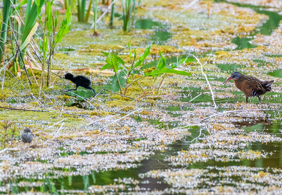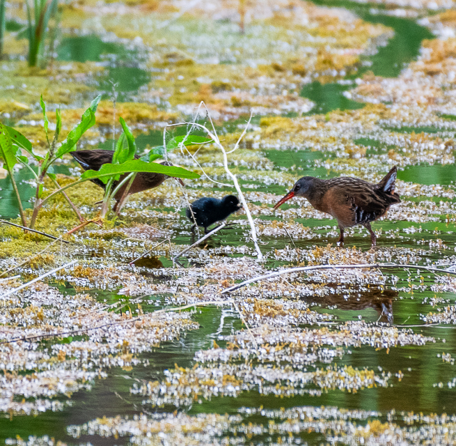 Have you ever seen a Virginia Rail? They are secretive birds, living in marshes with thick vegetation. They nest near the water’s surface, often in cattails. I have often heard them but seldom seen them. Last week I was lucky enough to hear them at a shallow lake from the road adjacent to it. I waited and soon I saw two fuzzy black youngsters and two adults. The adults were busy, darting back and forth, gathering food for the little ones. Most of the time, they shooed the babies back into the cattails. It looked like a full time job!