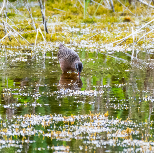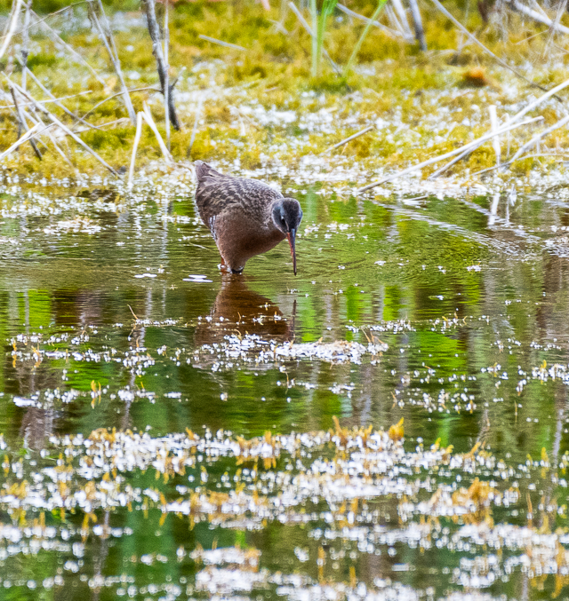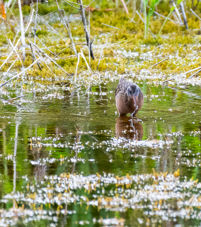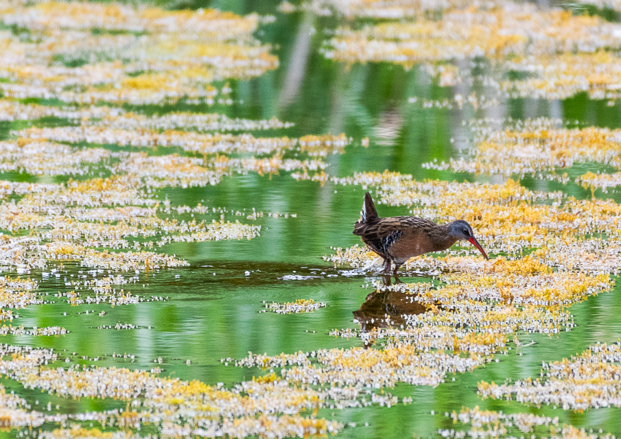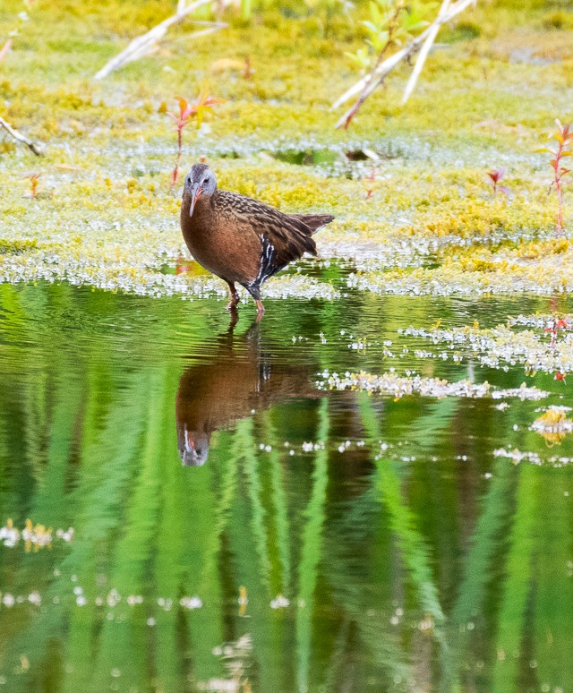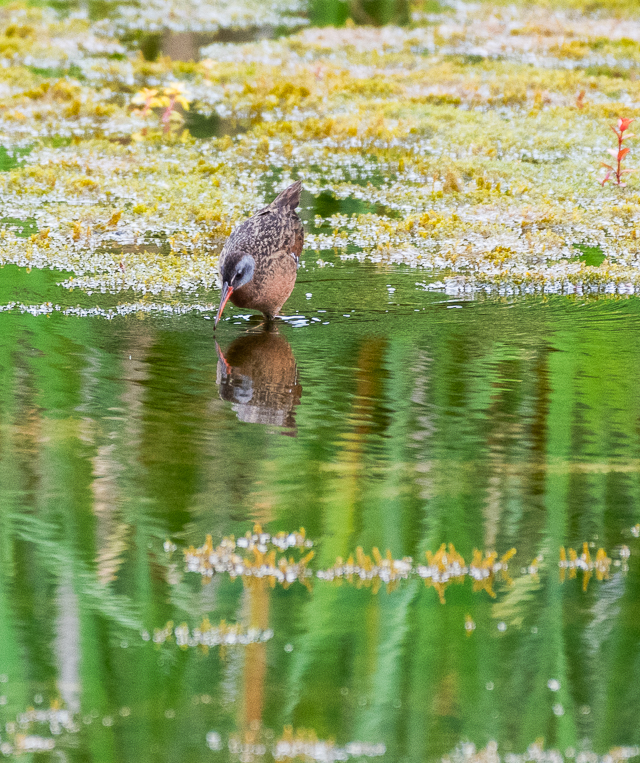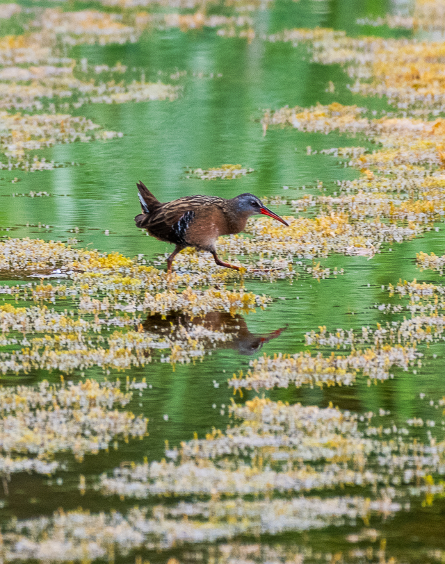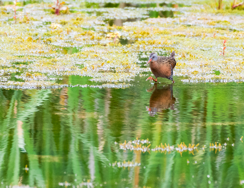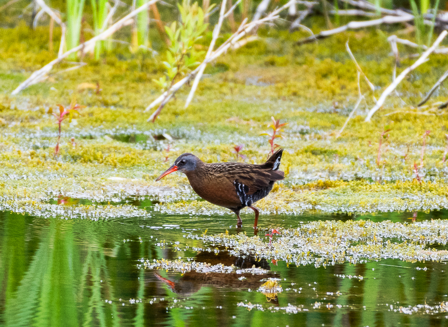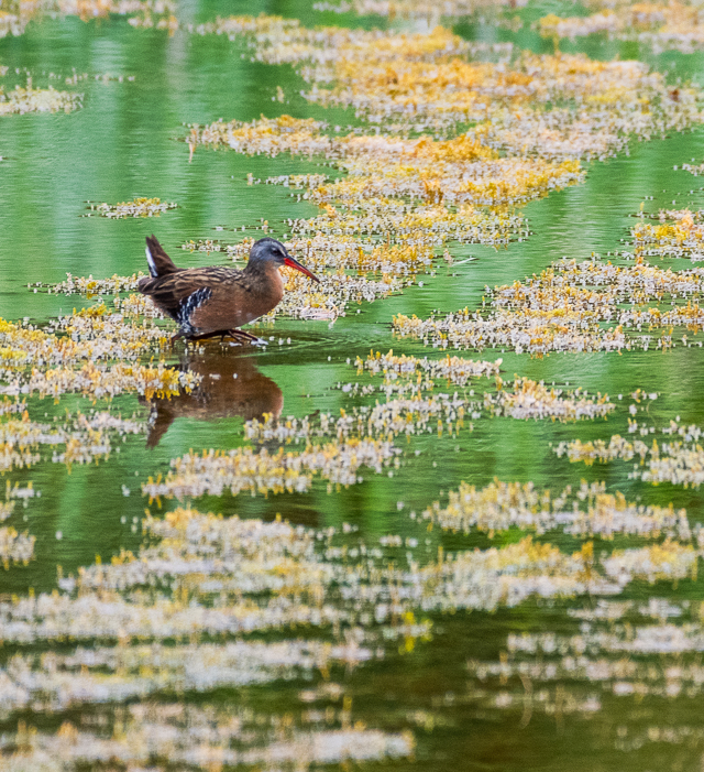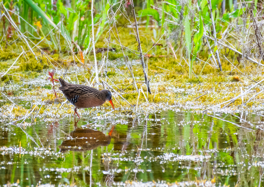 Have you ever seen a Virginia Rail? They are secretive birds, living in marshes with thick vegetation. They nest near the water’s surface, often in cattails. I have often heard them but seldom seen them. Last week I was lucky enough to hear them at a shallow lake from the road adjacent to it. I waited and soon I saw two fuzzy black youngsters and two adults. The adults were busy, darting back and forth, gathering food for the little ones. Most of the time, they shooed the babies back into the cattails. It looked like a full time job!