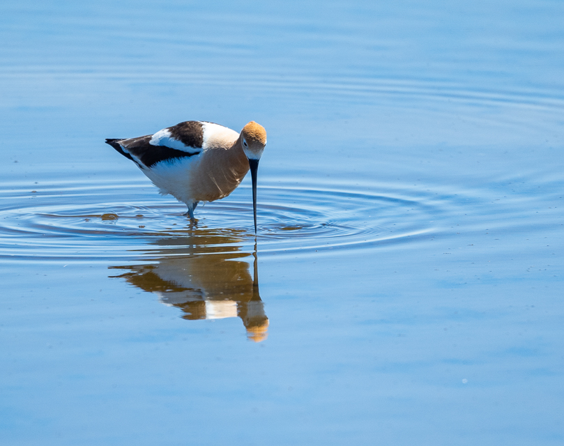Shorebirds are always fun to watch. Their gangly legs and long beaks are just so interesting. The Wilson’s Phalarope is a bit different, mostly foraging while afloat in shallow water. Another difference is that the female is the more colorful of the pair and the male incubates the eggs and gets the youngsters off to a good start in life. I think the avocets enjoy looking at their reflection.