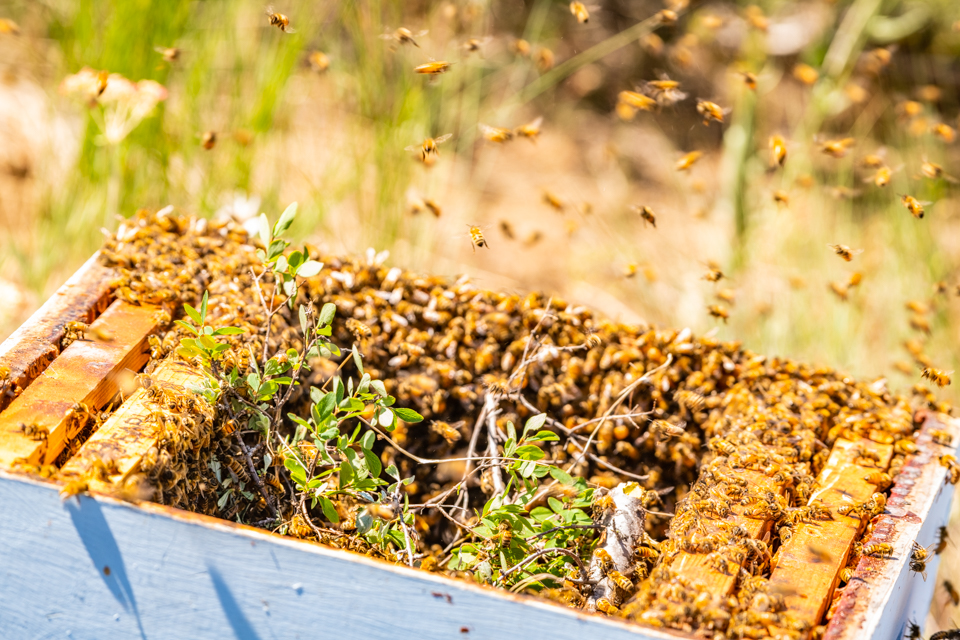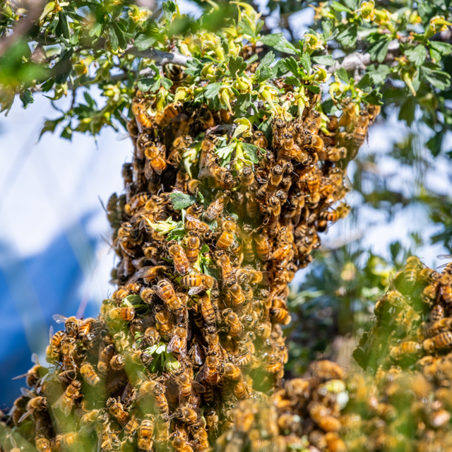 Ken has six active bee hives this year and yesterday one of them swarmed. Honeybee swarms are a natural occurrence and can be expected if hives are really busy and growing in population. The bees force the queen to slim down by not feeding her and she makes new queen cells so the bees left behind will have a new leader once the old one has swarmed. One of his hives from last year was thriving and constantly had bees ‘bearding’ on the front of it and Ken expected it to swarm.